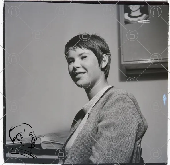 porträtt, kvinna, leende, svartvitt, fotografi, 1960-tal, kontor, kläder, kort hår, sittande, inomhus, bakgrund, dokument, ansikte, uttryck, vintage, stil, ungdom, naturligt ljus, personlig, minne, nostalgi, klassisk, enkelhet, charm, avslappnad, vänlig, professionell, interiör