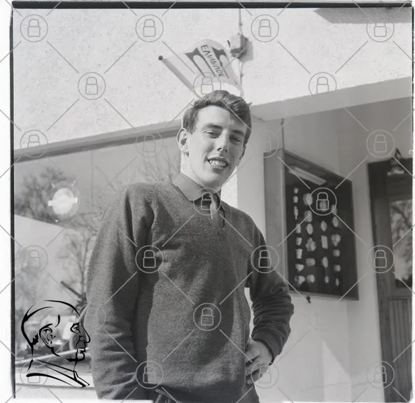man, svartvitt, leende, tröja, ungdom, byggnad, fönster, flagga, utomhus, porträtt, 1960-tal, stil, casual, kläder, fotografi, nostalgi, historia, kultur, samhälle, person