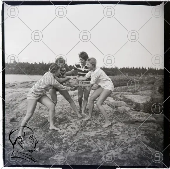 fyra, personer, klippor, sommar, svartvit, lek, natur, vatten, träd, badkläder, skratt, vänskap, utomhus, aktivitet, ungdomar