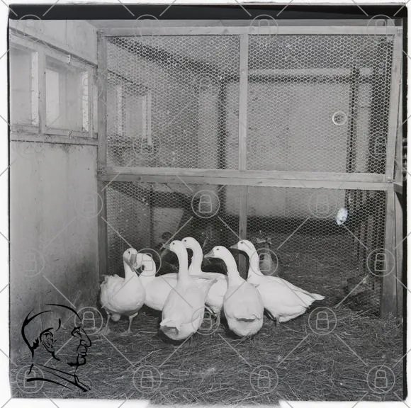 gåsar, höns, djur, stall, inomhus, bur, halm, fjädrar, lantbruk, gård, fåglar, vit, grön, nät, trä, fönster, djurhållning, husdjur, natur, landsbygd, uppfödning