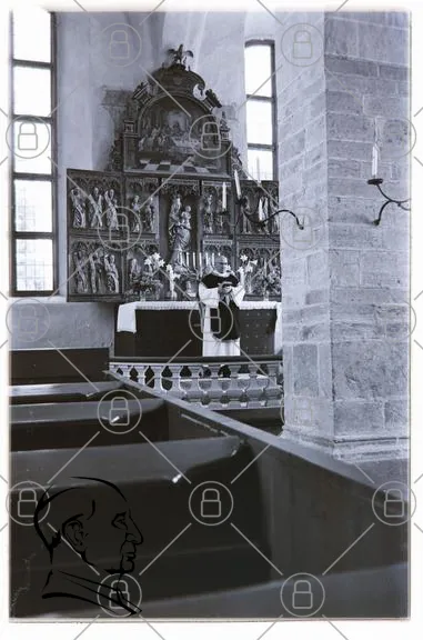kyrka, altare, präst, bänkar, fönster, trä, religiös, ceremoni, medeltid, gotisk, inredning, ljus, väggmålning, skulpturer, andakt, tradition, svartvitt, arkitektur, kultur, historia, rituell