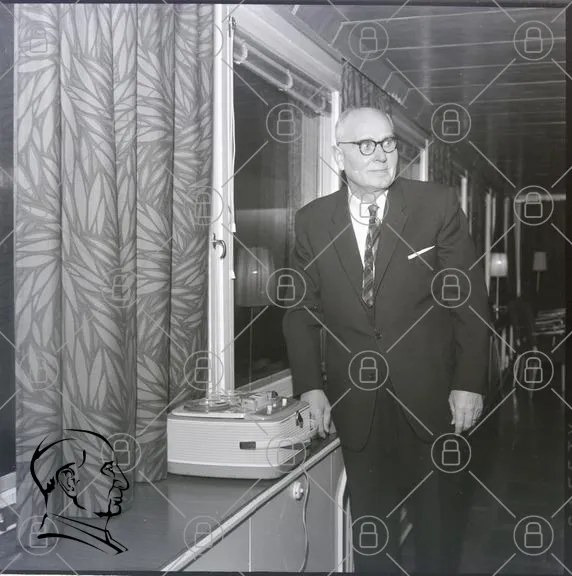 man, kostym, glasögon, vinylspelare, fönster, inredning, 1960-tal, svartvitt, rum, möbler, lampor, retro, stil, heminredning, musik, teknik, klassisk, elegant, kontor, skandinavisk