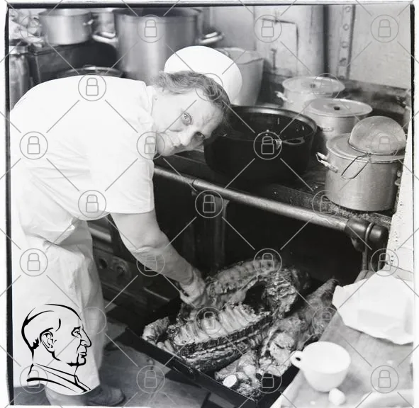 kvinna, kök, matlagning, ugn, gryta, kastrull, kockmössa, förkläde, stek, kött, spis, matberedning, restaurang, servering, köksredskap, traditionell, arbetsplats, mat, professionell, inomhus