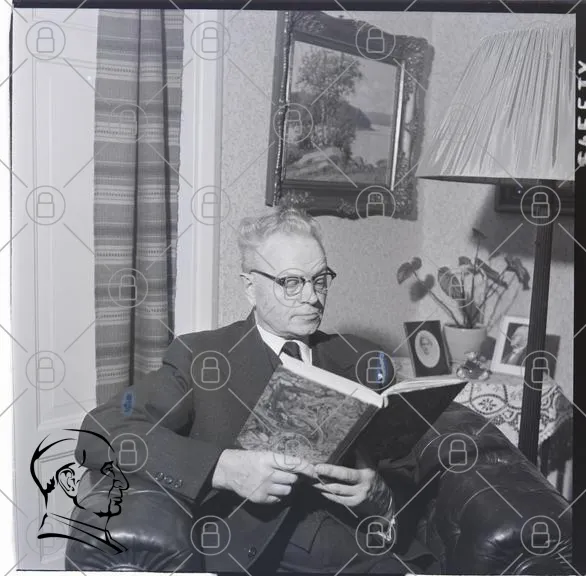 man, läsande, bok, glasögon, fåtölj, inomhus, lampa, väggkonst, blommor, svartvitt, kläder, porträtt, hem, möbler, gammaldags, intellektuell, stilla, fokus, sittande, äldre