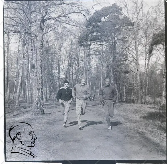 löpning, skog, träd, män, svartvitt, motion, natur, väg, sport, jogging, utomhus, aktivitet, 1900-tal, kläder, hälsa, träning, landskap, grupp, hastighet, friidrott