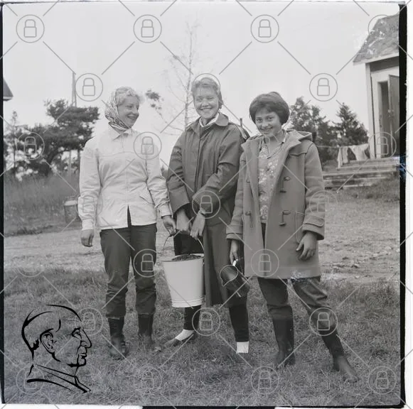 kvinnor, landsbygd, arbete, hink, kläder, 1950-tal, svartvitt, leende, natur, gård, gemenskap, tradition, ungdomar, utomhus, skog, fotografering, vänskap, rustik, jordbruk, kultur, historia, familj, sommar, fritid, glädje, samarbete, lokal, enkelhet, minnen, nostalgi