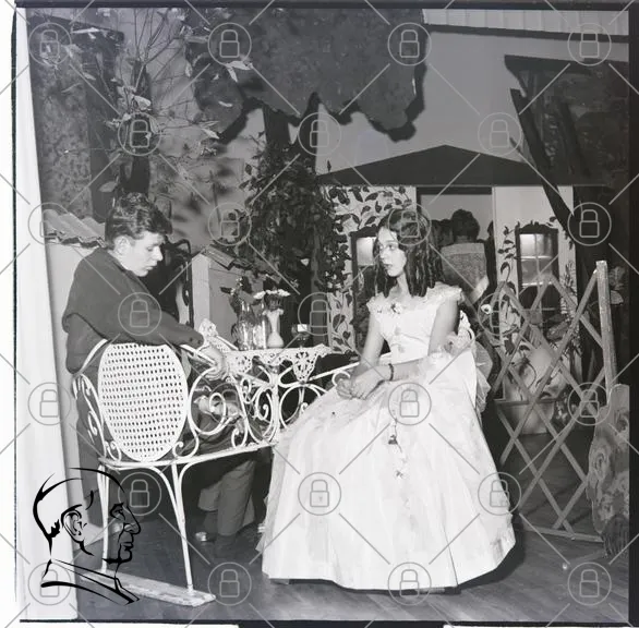 kvinna, klänning, mode, sittande, bord, växter, inredning, svartvitt, fotografi, 1950-tal, stil, elegans, hår, smycken, miljö, konst, dekoration, interiör, vintage, ungdom, skönhet, porträtt, socialt, samvaro, fest, evenemang, bakgrund, atmosfär, uttryck, känsla