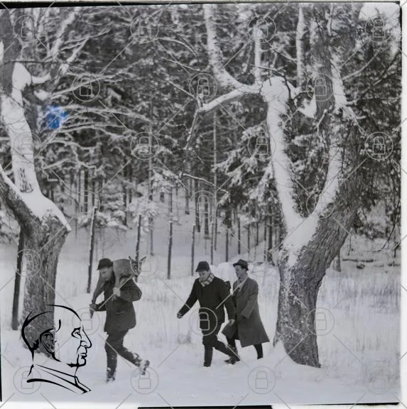 snö, skog, vinter, män, jakt, träd, kläder, natur, fotspår, djur, vildmark, landskap, svartvitt, tradition, friluftsliv, vinterkläder, vapen, avskjutning, gemenskap, promenad