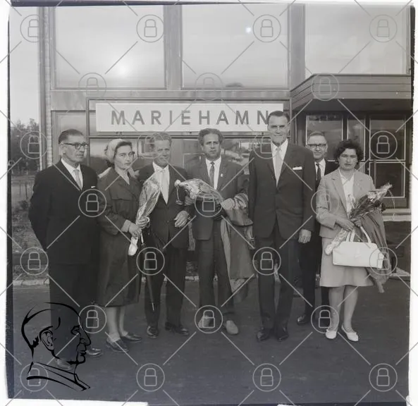 Mariehamn, grupp, människor, blommor, 1960-tal, svartvit, kläder, station, välkomnande, fotografering, historisk, evenemang, resande, samling, tradition, stil, ansikten, leenden, män, kvinnor, offentlig, plats, minnen, kultur, samhälle, festligheter, vänskap, gemenskap, historia