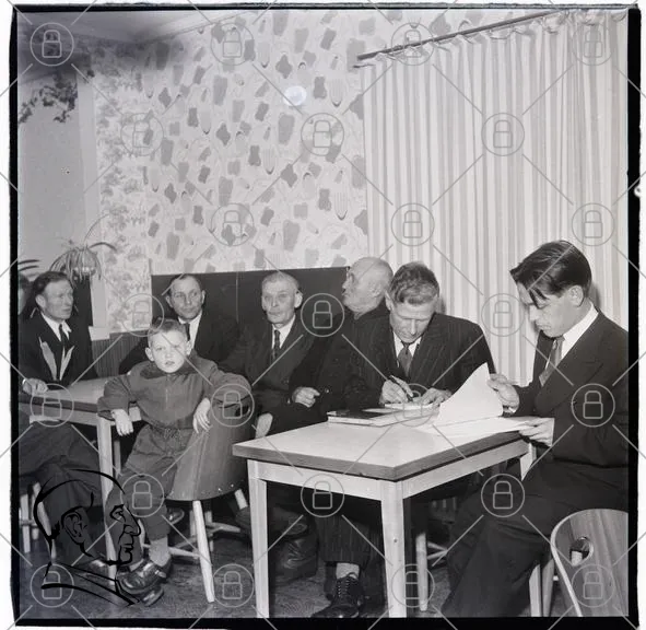 grupp, människor, bord, stolar, barn, vuxna, kostymer, inomhus, gardiner, väggdekoration, skrivande, möte, interiör, 1950-tal, formellt, papper, diskussion, sittande, allvarliga, koncentration