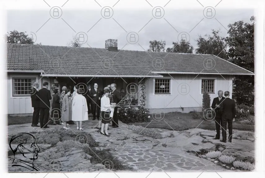hus, fest, människor, kläder, trädgård, gräsmatta, stenar, samling, 1960-tal, utomhus, socialt, byggnad, fotografering, stil, tradition, sällskap, vänner, familj, svartvitt, evenemang, interaktion, glädje, samvaro, landskap, natur, bakgård, dekoration, stil, gemenskap, minnen