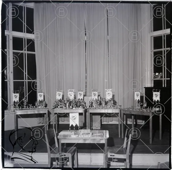 trophéer, priser, bord, fönster, gardiner, inomhus, dekoration, evenemang, ceremoni, stolar, trä, belysning, svartvitt, arrangemang, fest, utmärkelse, presentation, sport, klubb, samling, festlighet, hjärta, symbol, tradition, tävling, utställning, skålar, medaljer, statyetter, bordduk