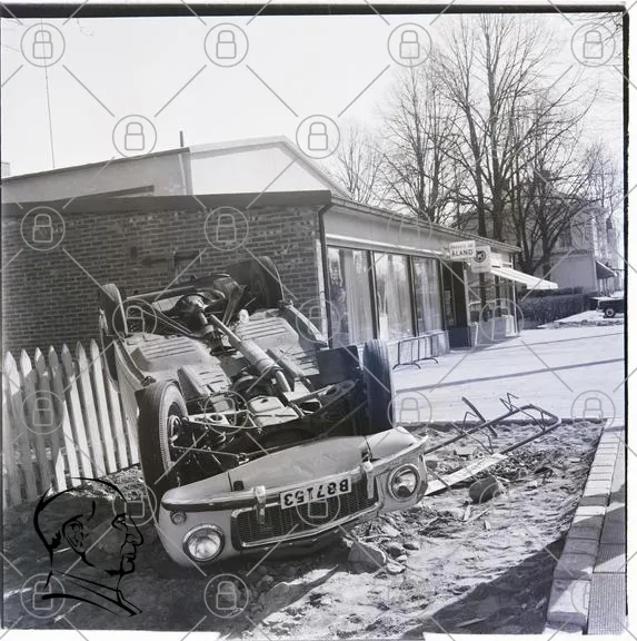 bil, krasch, upp och ner, gata, hus, träd, staket, asfalt, skada, parkerad, gammal, svartvit, olycka, nummerplåt, C51488, trottoar, byggnad, trafik, stadsbild, 1960-tal, fotografering, urban, landskap, förstörelse, incident, väg, förare, motorfordon, säkerhet, miljö