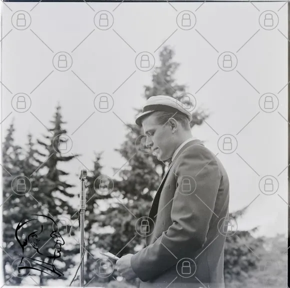 man, hatt, talare, mikrofon, träd, svartvitt, kläder, 1900-tal, utomhus, profil, ungdom, stil, tradition, ceremoni, publik, historia, vintage, fotografi, uttryck, fokus, natur, sommar, evenemang, gammal, nostalgi, skandinavisk, manlig, klädd, elegant, stående