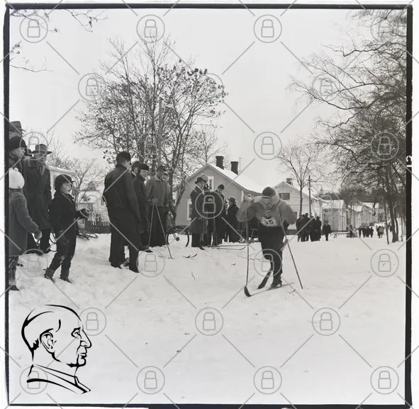 skidåkning, vinter, snö, tävling, åskådare, träd, hus, gammaldags, svartvitt, sport, utomhus, skidspår, publik, kläder, mössa, stavar, landskap, stadsmiljö, aktivitet, rörelse