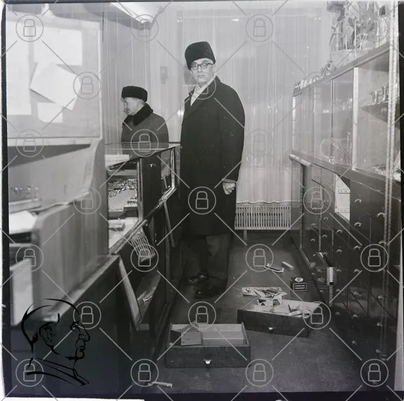 butik, man, hatt, kappa, glasmontrar, skåp, lådor, inredning, 1900-tal, svartvitt, fönster, föremål, besökare, kontor, stämning, retro, historisk, detaljer, föremål, skatter, övervakning, miljö, tidsepok, fotografi, interiör, affär, varor, skåp, belysning