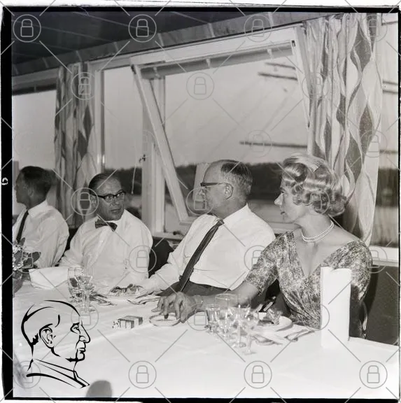middag, fest, kläder, 1950-tal, bord, glas, servett, män, kvinnor, båt, fönster, dekoration, samtal, sällskap, eleganta, leenden, stil, mat, dukning, ljus, bakgrund, inredning, socialt, samvaro, vintage, svartvitt, fotografi, nostalgi, tidsepok, festligheter
