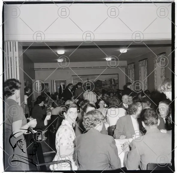 middag, människor, samling, interiör, bord, stolar, socialt, evenemang, kläder, belysning, väggmålning, gardiner, konversation, grupp, sittande, stående, formellt, mat, dryck, 1950-tal