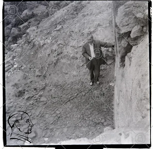 man, kläder, sten, mark, grus, arkeologi, utgrävning, gammal, svartvit, landskap, natur, byggnad, historisk, fotografi, forskning, vetenskap, miljö, detaljer, struktur, föremål, hand, kroppsspråk, tid, plats, kultur, tradition, upptäckter, geologi, miljö, textur