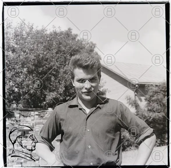 pojke, ung man, porträtt, svartvitt, utomhus, träd, byggnad, vägg, kläder, leende, 1960-tal, fotografi, ungdom, natur, casual, stil, ansikte, bakgrund, sommar, ljus