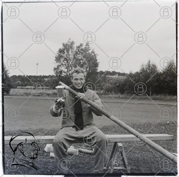 pojke, stav, träning, sport, gymnastik, utomhus, leende, gräs, skog, bänk, utrustning, ungdom, aktivitet, motion, natur, svartvitt, fotografi, 1900-tal, ungdomssport, gymnastikredskap