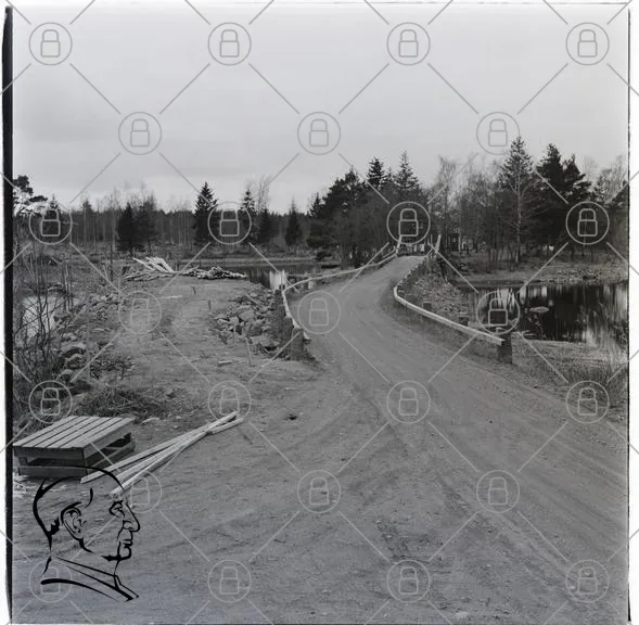 väg, skog, vatten, träd, sten, byggmaterial, landskap, natur, grus, bro, reflektion, stillhet, höst, vägkurva, damm, plankor, byggprojekt, svartvit, stillbild, utomhus