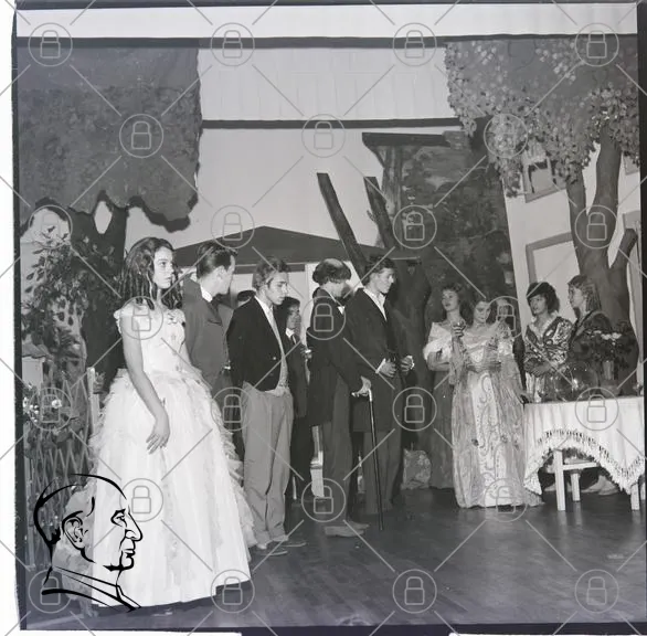 bal, klänningar, kostymer, ungdomar, scen, teater, fest, 1950-tal, svartvitt, trädkuliss, sällskap, dans, klänning, eleganta, kostym, kvinnor, män, traditionell, festlig, uppträdande, samling, dekoration, ljus, glädje, evenemang, socialt, kultur, historisk, minnen