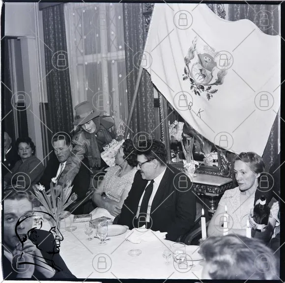 middag, fest, flagga, bord, gäster, blommor, ljus, kläder, 1900-tal, samling, fotografering, tradition, dekoration, leenden, samtal, dryck, mat, sällskap, kultur, historia, evenemang, festligheter, socialt, gemenskap, stil, elegans, minnen, festmåltid, bakgrund, uttryck