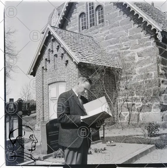 man, bok, läsning, kyrka, byggnad, träd, gravsten, svartvitt, kläder, 1940-tal, utomhus, arkitektur, historia, kultur, landskap, fotografi, tradition, forskning, studier, stillhet, natur, monument, samhälle, tid, minne, plats, kunskap, utbildning, miljö, detaljer