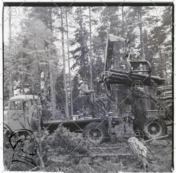 skogsarbete, lastbil, timmer, skog, maskin, arbetare, trä, avverkning, natur, industri, 1900-tal, fordon, virke, landskap, trädfällning, hantverk, skogsbruk, mekanisering, arbetsplats, historisk