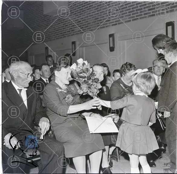 grupp, människor, blommor, ceremoni, kläder, leenden, barn, vuxna, samling, 1950-tal, inomhus, evenemang, glädje, tradition, porträtt, fest, uppvaktning, familj, minnen, gemenskap