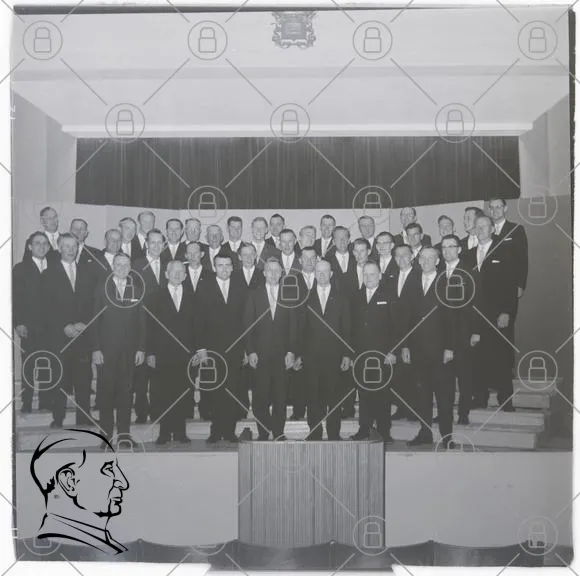 grupp, män, kostymer, svartvitt, fotografi, scen, samling, formell, klädsel, 1950-tal, porträtt, evenemang, bakgrund, stående, uppställning, traditionell, högtidlig, leenden, gemenskap, kultur, historia, presentation, artister, musik, föreställning, teater, samarbete, professionell, stil