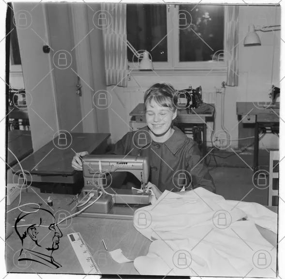 sömnad, symaskin, barn, leende, textil, hantverk, inomhus, skola, kläder, tyg, arbete, 1950-tal, utbildning, kreativitet, sy, symaskinsverkstad, ljus, bord, tråd, mönster, tygstycke, ungdom, hobby, handarbete, sykurs, klassrum, retro, svartvitt, nostalgi, flicka