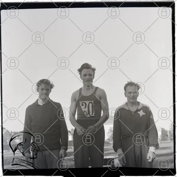 idrottare, sport, tävling, 1940-tal, svartvit, män, nummer 20, atlet, kläder, utomhus, grupp, ungdomar, prestation, historisk, fotografi, motion, gymnasieidrott, stil, tradition, samarbete