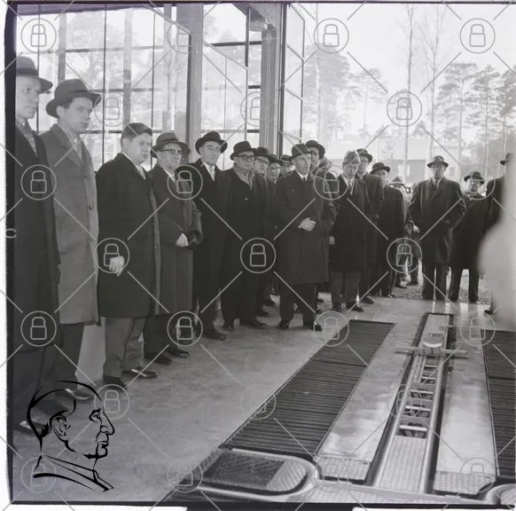 historisk, svartvit, män, kostymer, hattar, samling, byggnad, verkstad, 1900-tal, ceremon, offentlig, grupp, teknik, transport, maskiner, industri, tradition, fotografering, evenemang, inspektion, linje, plattform, bilar, fordon, arbete, samhälle, kultur, historia, stil, formell
