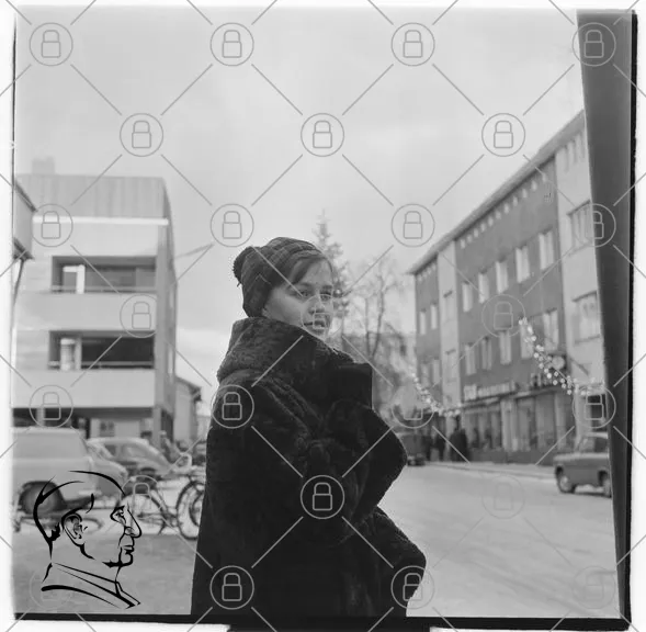 kvinna, vinter, päls, hatt, gata, byggnader, cyklar, svartvitt, stad, träd, mode, 1960-tal, urban, promenad, skyltar, människor, fotografering, nostalgi, stil, landskap