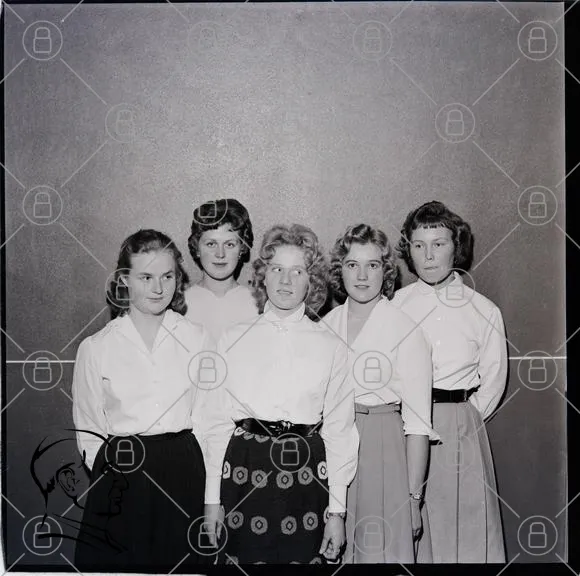 fem kvinnor, svartvitt, 1950-tal, kläder, porträtt, leende, vintage, mode, gruppfoto, bakgrund, frisyrer, kjolar, blusar, stil, ungdomar, fotografi, klassisk, retro, ansikten, gemenskap
