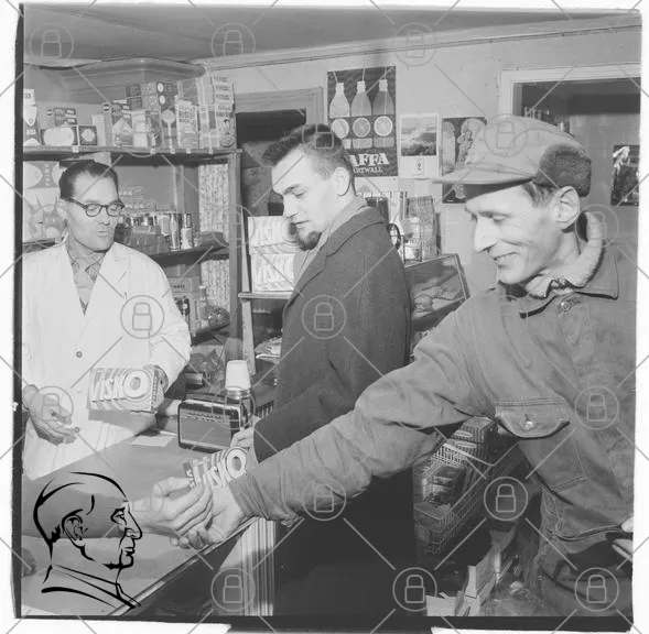 butik, män, handskakning, varor, Viskö, 1950-tal, kläder, interiör, försäljning, livsmedel, kassör, kunder, retro, svartvitt, samspel, affär, service, lokal, tradition, handel, samhälle, produkter, disk, hyllor, reklam, ansikten, gest, vänskap, möte, historia