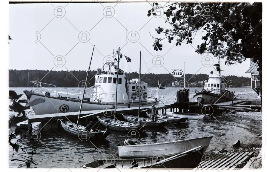 båtar, hamn, vatten, Esso, skärgård, motorbåt, roddbåt, träd, flaggor, brygga, svartvitt, landskap, sjöfart, båtliv, natur, sommar, fritid, båtliv, kaj, båtplats