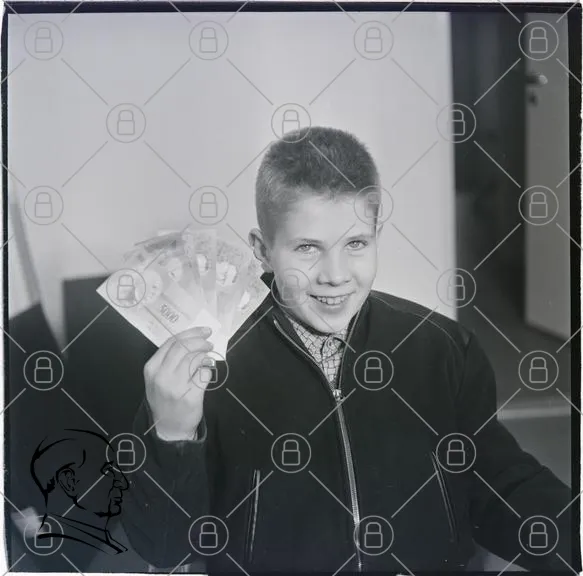 pojke, pengar, sedlar, leende, svartvitt, inomhus, kläder, jacka, rum, ungdom, ekonomi, nöje, 1960-tal, porträtt, barn, lycklig, hand, valuta, svenska, kontanter, fotografi, nostalgi, ungdomskultur, vardag, familj, minnen, barndom, uttryck, gest, samling