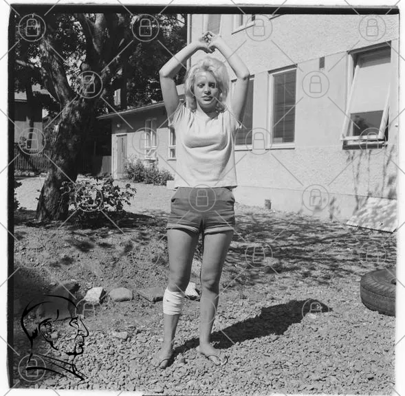 kvinna, trädgård, sommar, shorts, t-shirt, barfota, skada, bandage, hus, fönster, svartvitt, utomhus, pose, ungdom, natur, grus, sol, ljus, avslappnad, leende, kvinna med blont hår, kroppsspråk, fotografi, retro, 1960-tal, vardag, casual, stil, enkelhet
