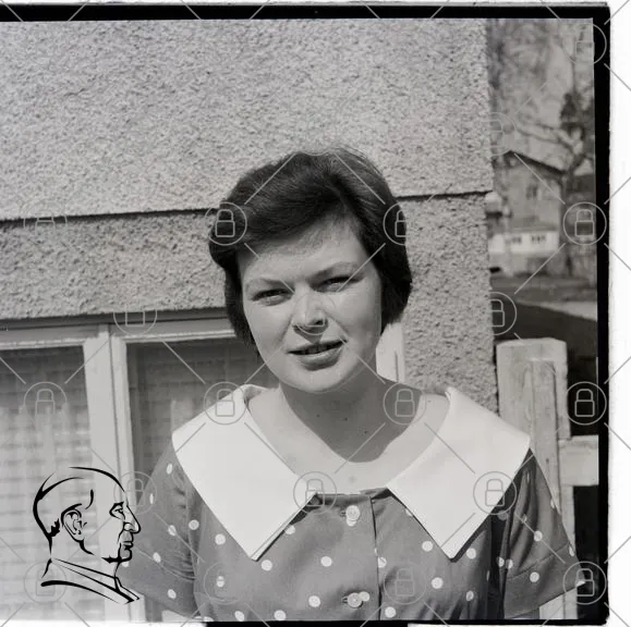 kvinna, svartvitt, porträtt, klänning, prickar, 1950-tal, utomhus, hus, fönster, frisyr, leende, vintage, mode, fotografi, ansikte, stil, bakgrund, gammal, nostalgi, personlig, kvinnoideal, tidsepok, uttryck, socialt, kultur, historia, minne, tradition, elegans, charm