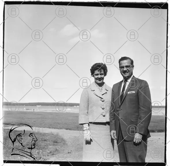 par, kvinna, man, kläder, 1950-tal, svartvitt, porträtt, utomhus, landskap, himmel, gräs, stil, mode, leende, fotografi, vintage, elegant, accessoarer, kostym, jacka, blus, smycken, natur, bakgrund, traditionell, socialt, samspel, glädje, minne, nostalgi