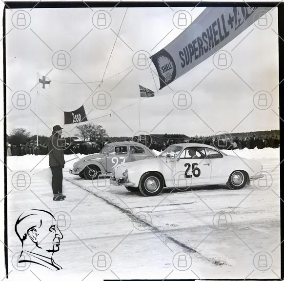 bil, racing, snö, vinter, tävling, nummer 26, nummer 27, publik, flaggor, Supershell, svartvitt, motorsport, körning, is, sportbil, förare, vintertävling, bilsport, retro, historisk, 1960-tal, skidor, landskap, tävlingsbana, bilar, motorer, hastighet, tradition, evenemang, fotografering