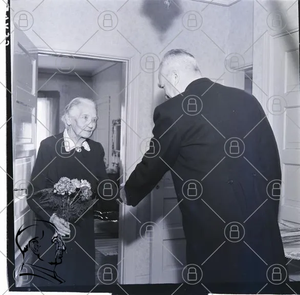 gammal kvinna, blommor, besök, leende, inomhus, dörr, man, klänning, svartvitt, interiör, vänskap, glädje, tradition, familj, högtid, omtanke, kärlek, minnen, samvaro, festligheter