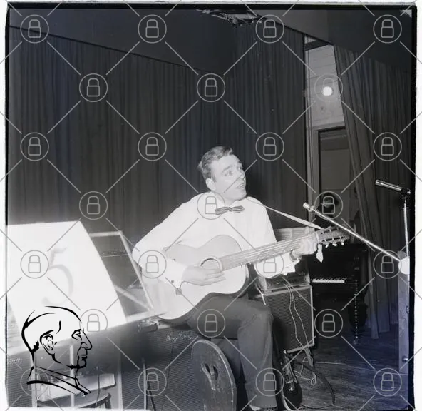 man, gitarr, sångare, scen, musik, svartvitt, kläder, mikrofon, publik, underhållning, 1950-tal, artist, föreställning, belysning, instrument, notställ, bowtie, retro, live, performance, kultur, show, akustisk, melodisk, framträdande, teater, ljud, kreativitet, uttryck