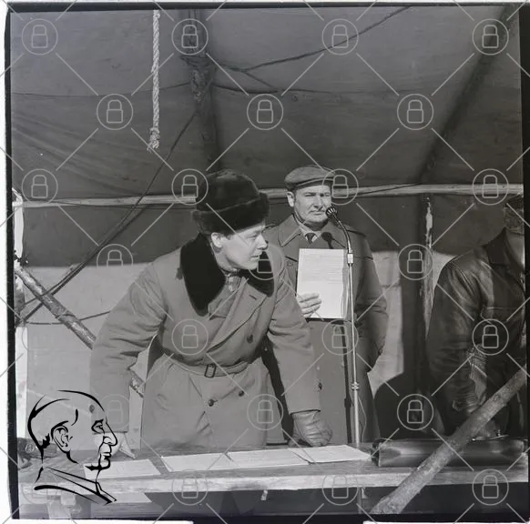 talare, tält, vinter, kläder, mikrofon, dokument, män, kvinnor, hattar, officiell, samling, svartvitt, historisk, presentation, podium, anteckningar, publik, ledare, evenemang, utomhus, 1900-tal, klädd, gestikulera, stående, sittande, uttryck, samarbete, kommunikation, tradition