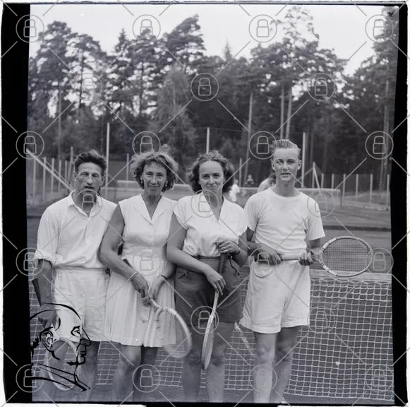 tennis, spelare, sport, nät, racketar, grönska, kläder, 1900-tal, utomhus, grupp, kvinnor, män, sommar, aktivitet, träning, tävling, foto, svartvitt, retro, ungdomar, leenden, vänskap, motion, fritid, natur, idrott, tradition, gemenskap, glädje