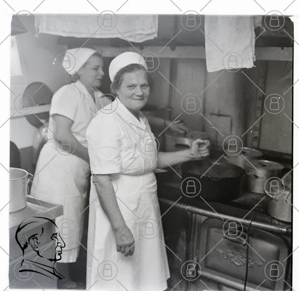 kök, kvinnor, matlagning, kastruller, spis, uniform, huvudduk, gammaldags, inomhus, arbete, matberedning, köksredskap, traditionellt, arbetskläder, kökshandduk