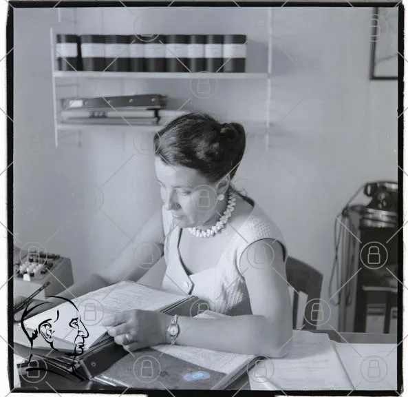 kvinna, skrivbord, dokument, pärmar, kontor, vintage, svartvitt, smycken, anteckningar, telefon, arbetsmiljö, 1950-tal, kontorsarbete, koncentration, papper, skrivmaskin, bokhylla, kontorsutrustning, stil, professionell, arbete, administration, retro, kläder, pärm, penna, tidning, kontorsstol, kontorslandskap, arbetsuppgifter